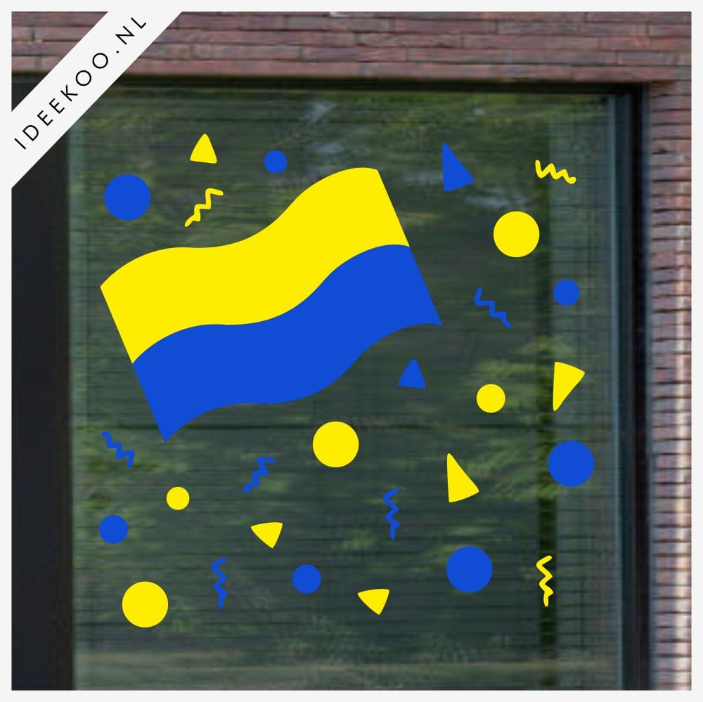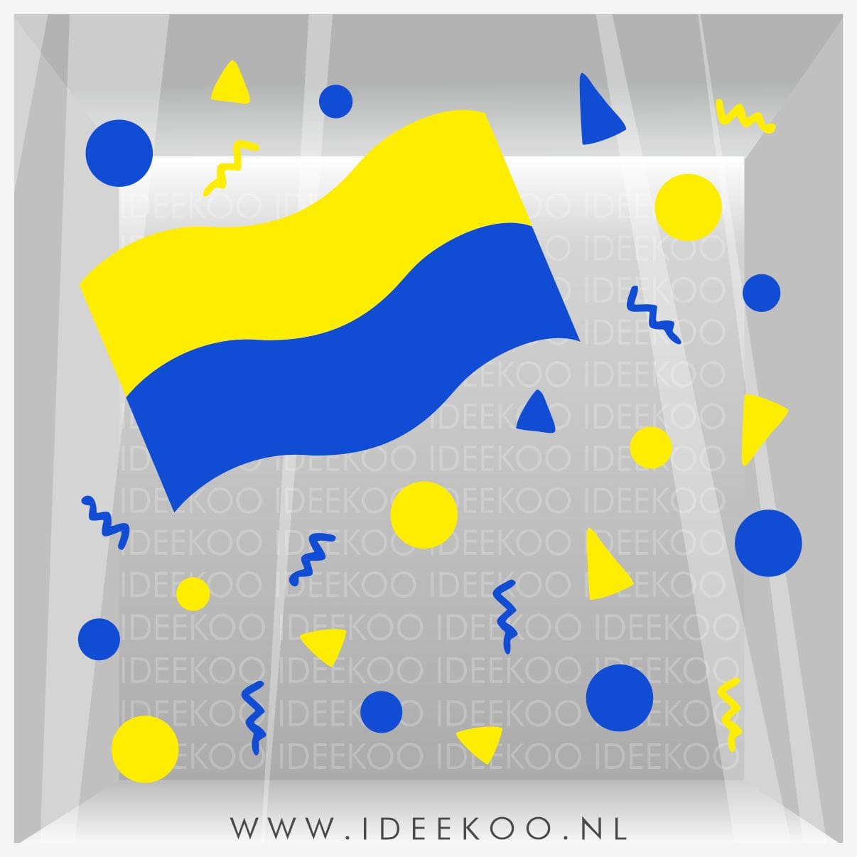 Herbruikbare raamsticker Carnavalsticker Vlag met confetti Dwergonie blauw geel , gemaakt van statisch vinyl.